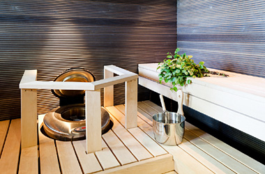 enemmän. Saunaterassin laidalla rentoudut puuverhoillussa